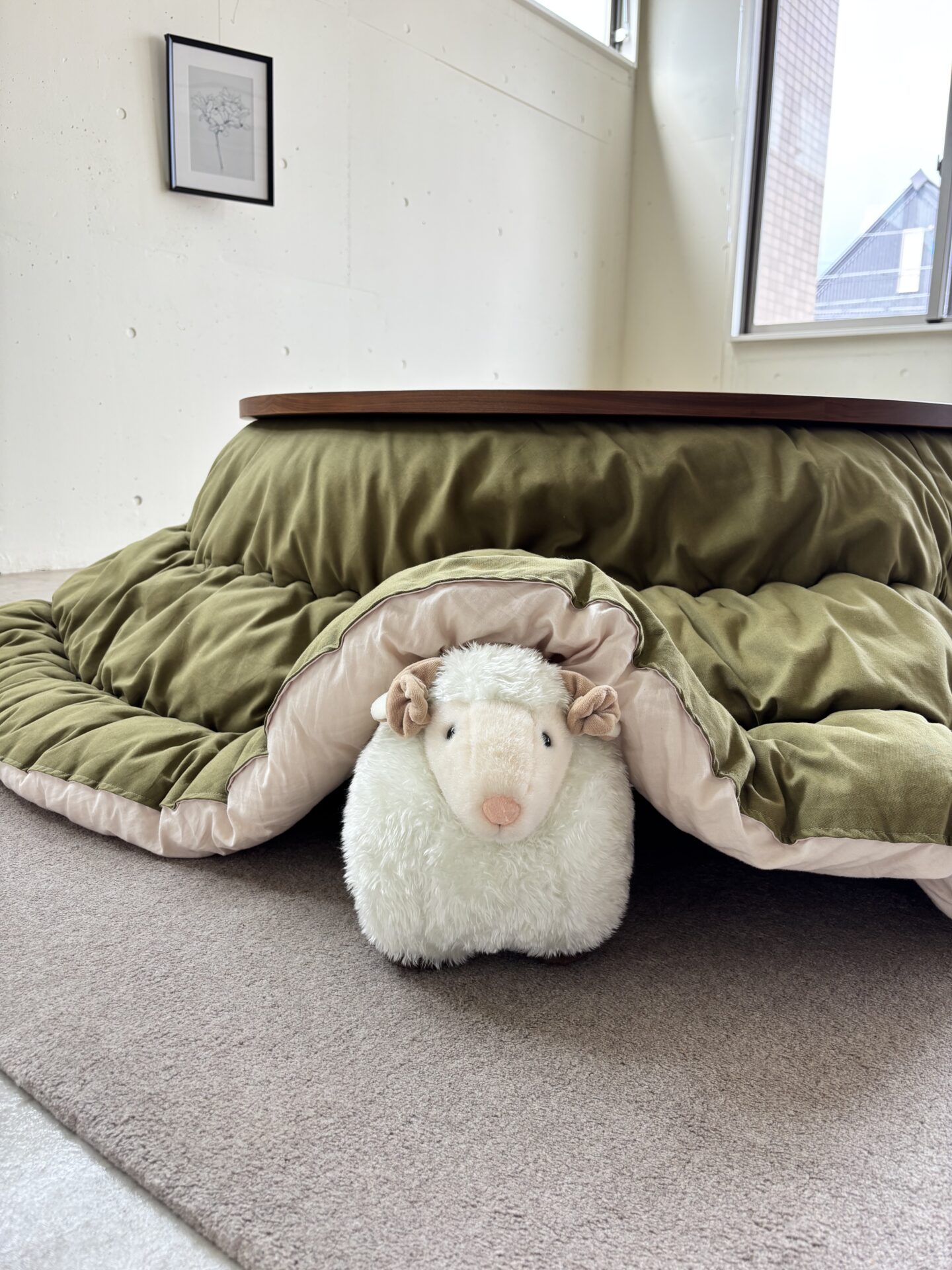 羊のぬいぐるみも、まるでこたつのぬくもりを楽しんでいるみたい (笑)