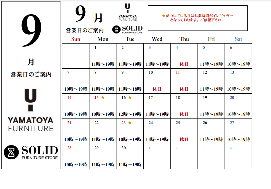 9月の営業日の案内です。