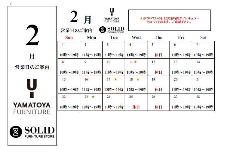 2026年2月の営業日の案内です。