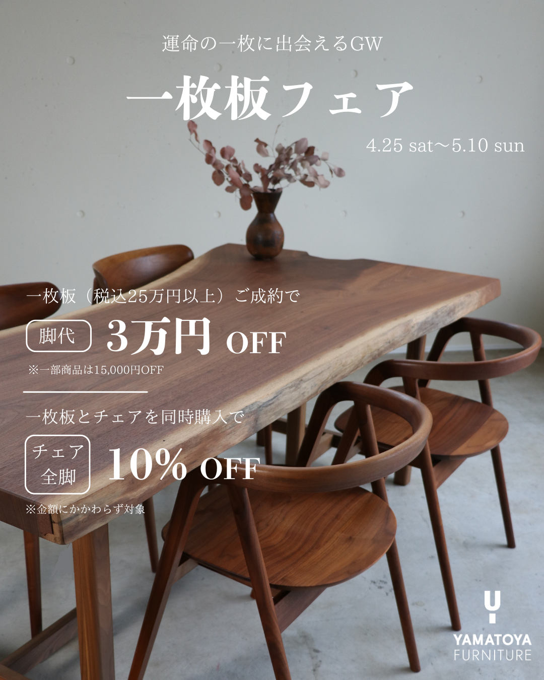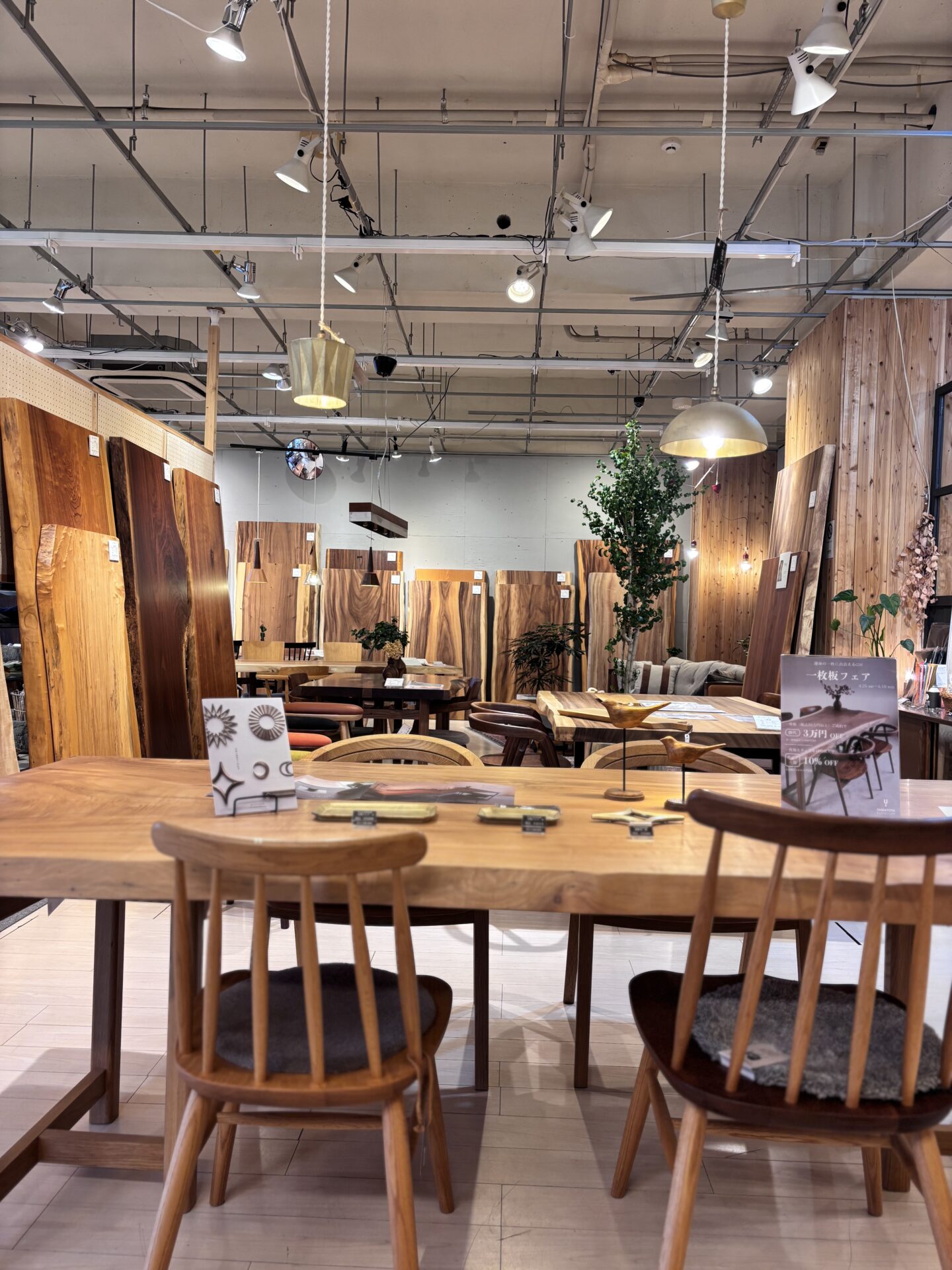 一枚板とともにチェアをご覧いただけることも強みですので、ぜひこの機会をご活用いただければと思います。