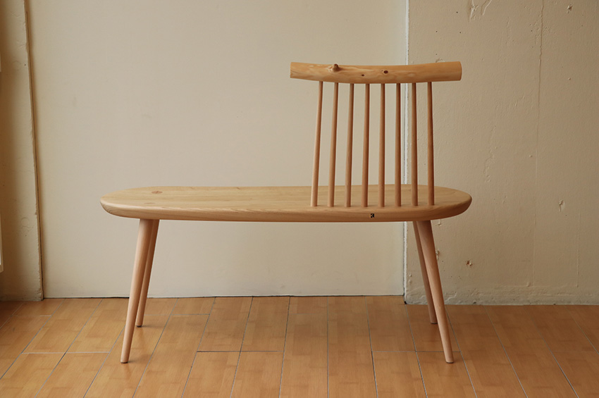 枝の美しさを活かした家具 ”kinoe”  笠木(椅子の背もたれに横渡しされているパーツ)に木の枝を使用したひとつして同じものがないキラリと光るチェアです。「木の笠木に枝を使おう!」そんな斬新なアイデアの発案者はデザイナーの貝山伊文紀 氏(Ibuki Kaiyama)。山に入ってはいい枝を拾いきれいになるまで磨くことによって、枝の表面はツルツルになめらかになります。
