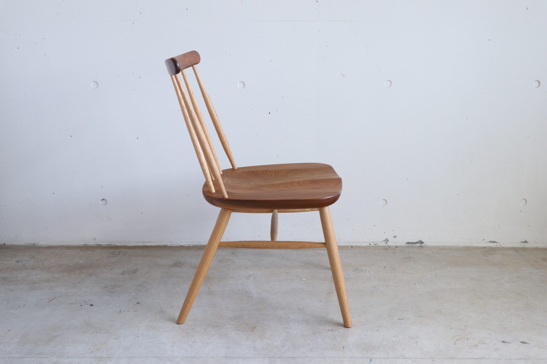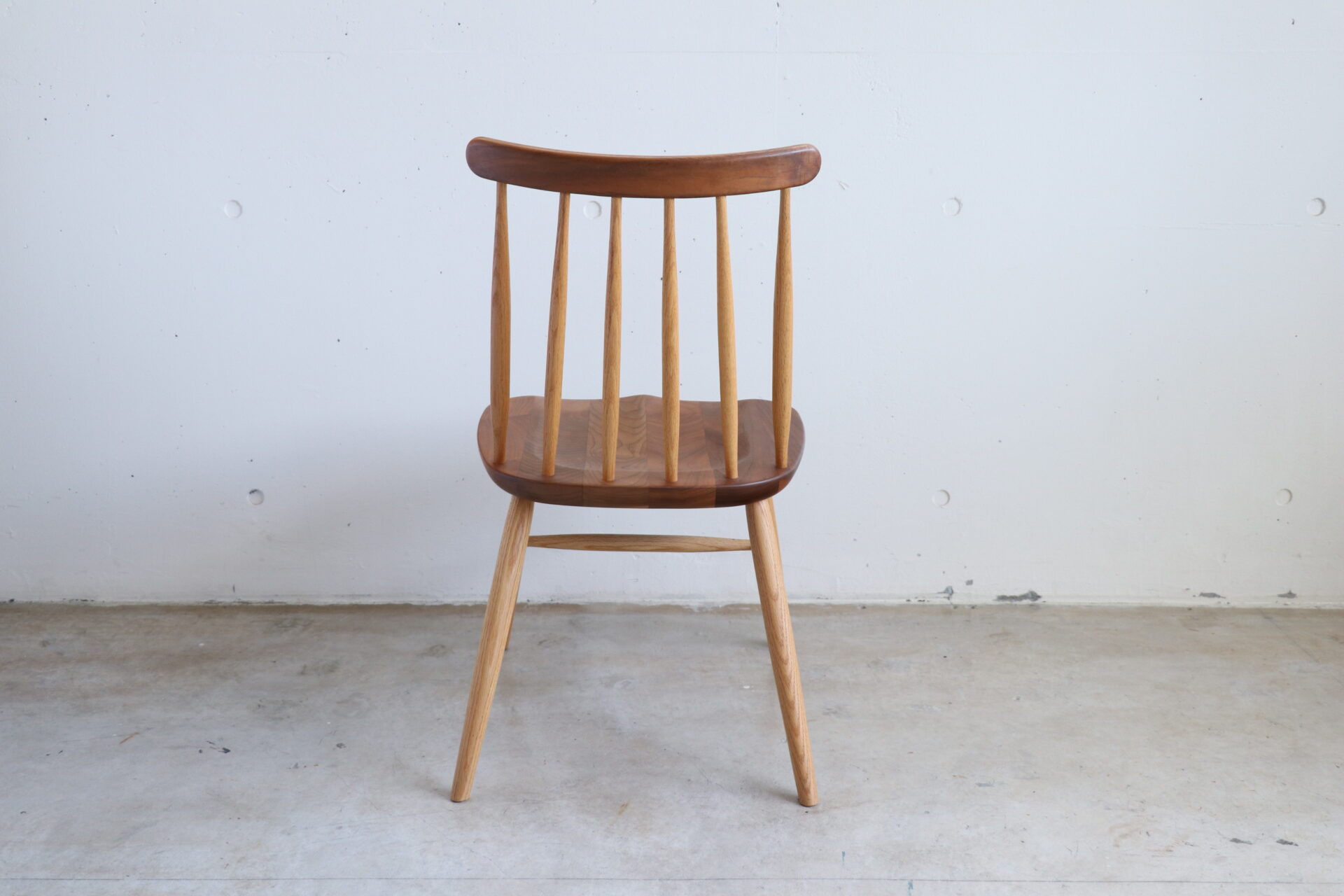 笠木のまるみもオチャメでかわいいのが特徴。細身で軽やかなフレームと、滑らかな背もたれのカーブが美しく、どんなインテリアにも調和します。写真のようにスポーク部分をレッドオーク材、笠木をウォールナット材のツートンでお造りも可能です。