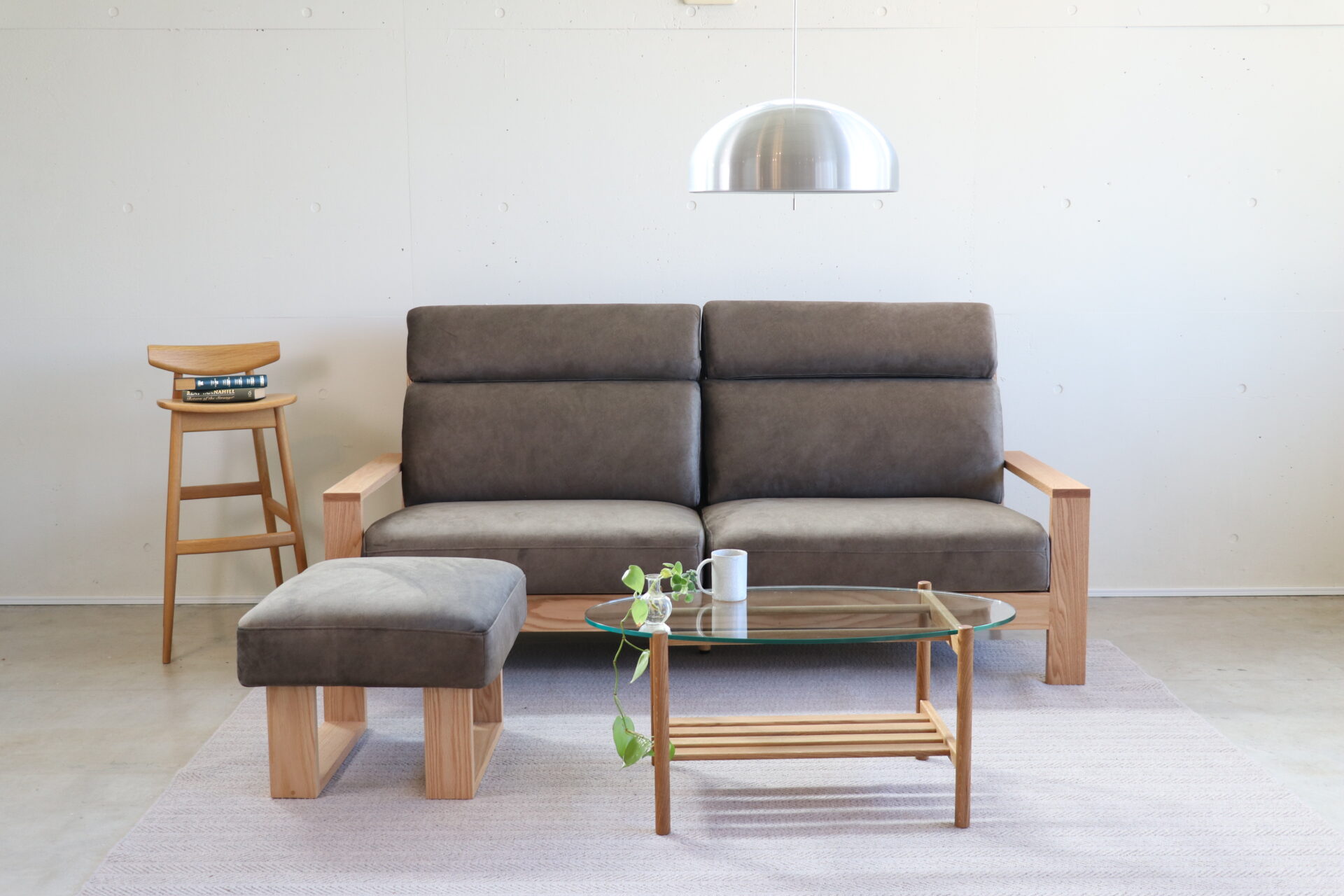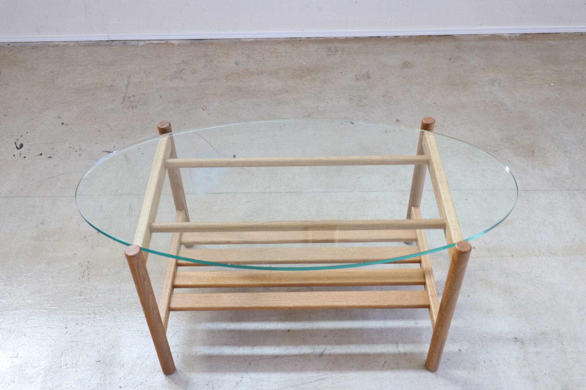 下の棚板が直線で出来ているため、天板の丸みとのバランスがよく、素敵なデザインになっています。