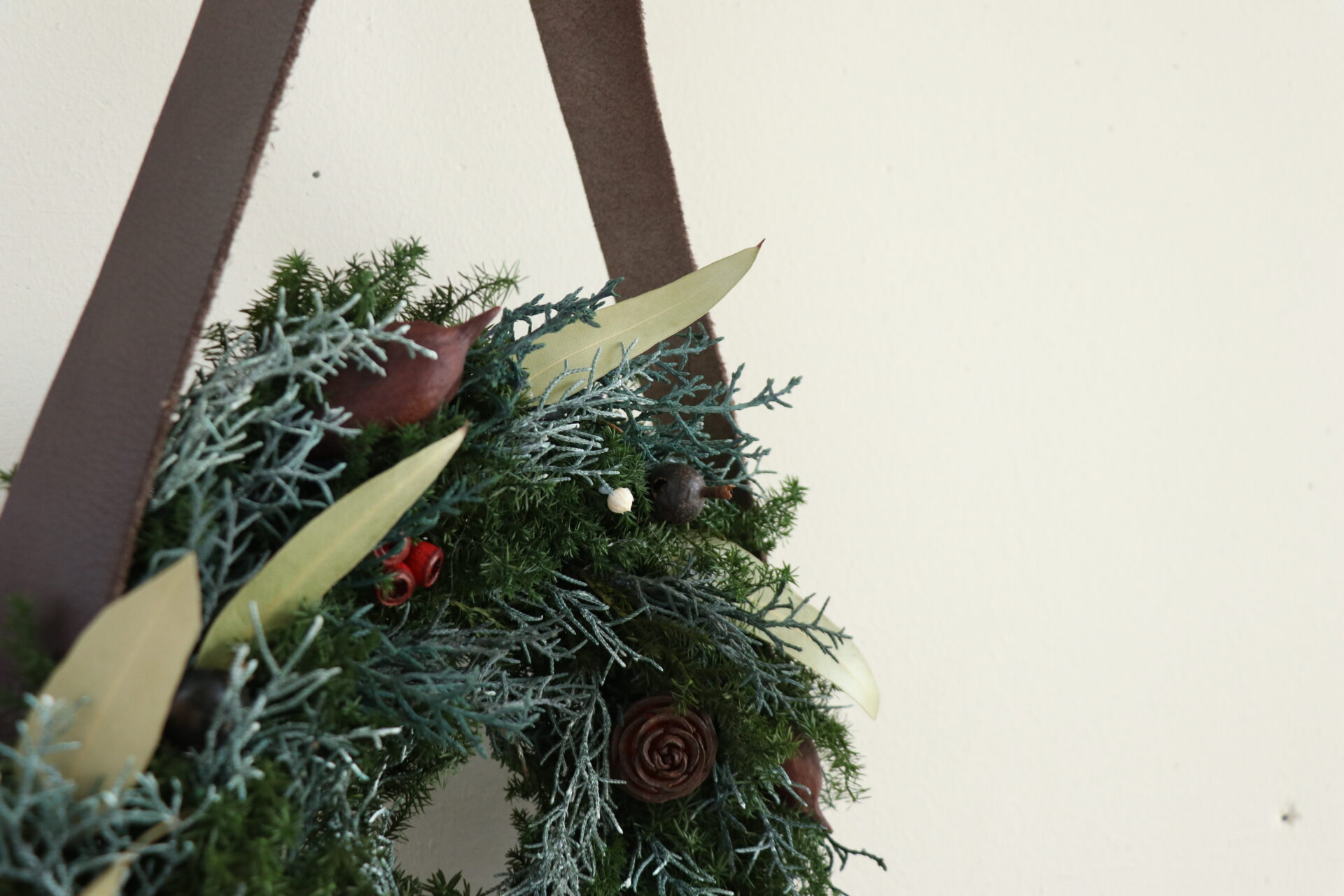 リースのグリーンと当店で施した本革のベルトの相性がめちゃいいです。